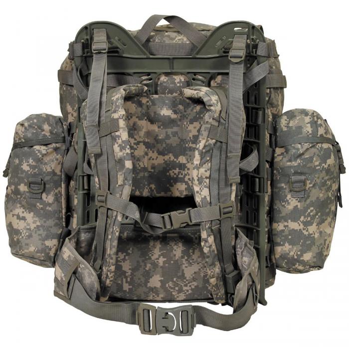 Molle II batohový systém se skládá s hlavního batohu, 2 postraní kapsy, 2 polstrovaných ramenních popruhů, polstrovaného pásu a plastového rámu.